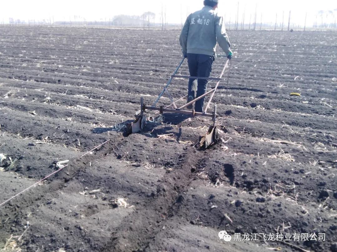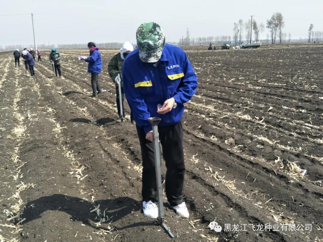 飛龍種業(yè)科研育種基地主要采用人工播種。播種前,科研人員根據播種需求調好自制播種器的尺寸。播種時,手持播種器插入壟臺正中,每次投放兩粒種子,再用腳踩實即可。