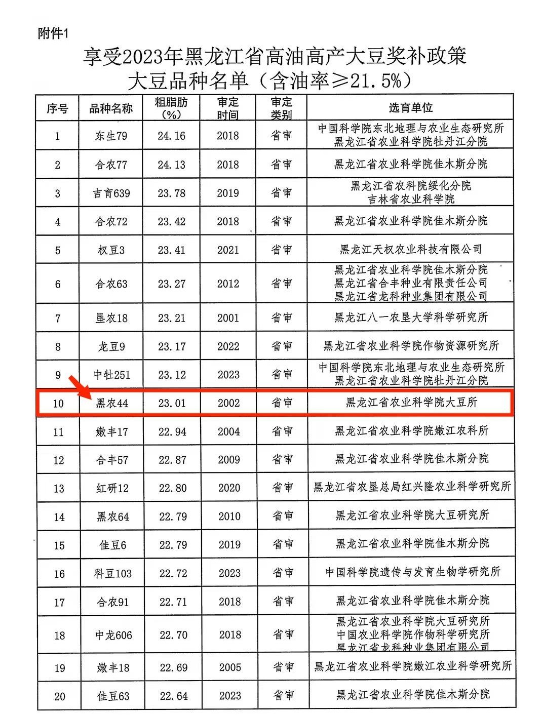 附件:1.享受2023年黑龍江省高油高產(chǎn)大豆獎補政策大豆品種名單(含油率≥21.5%)